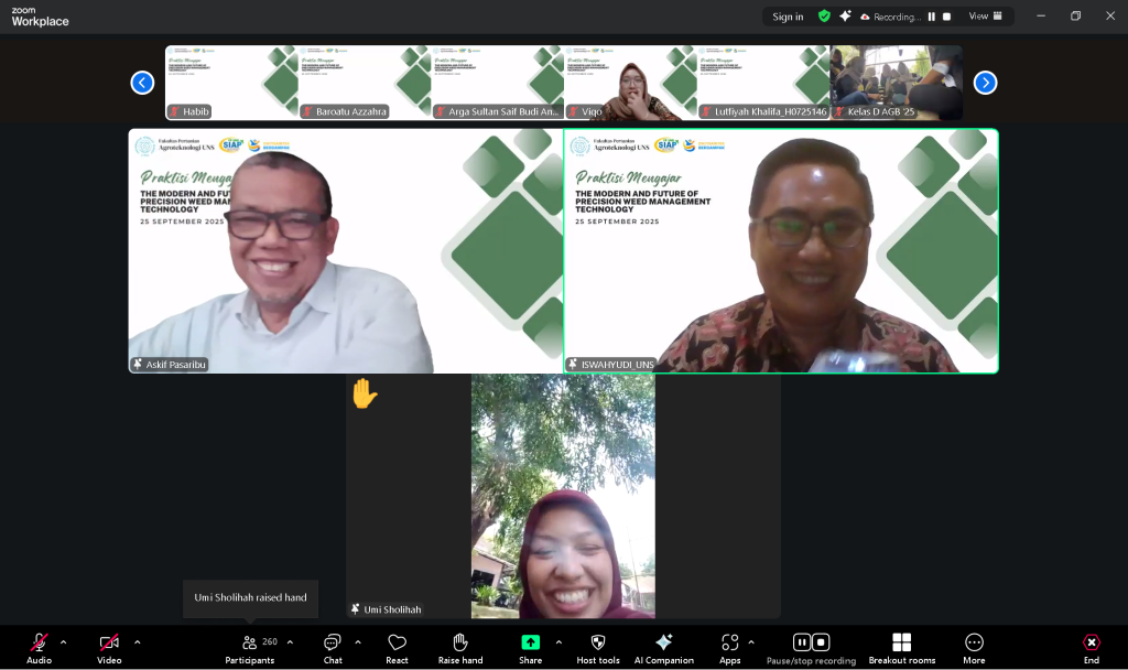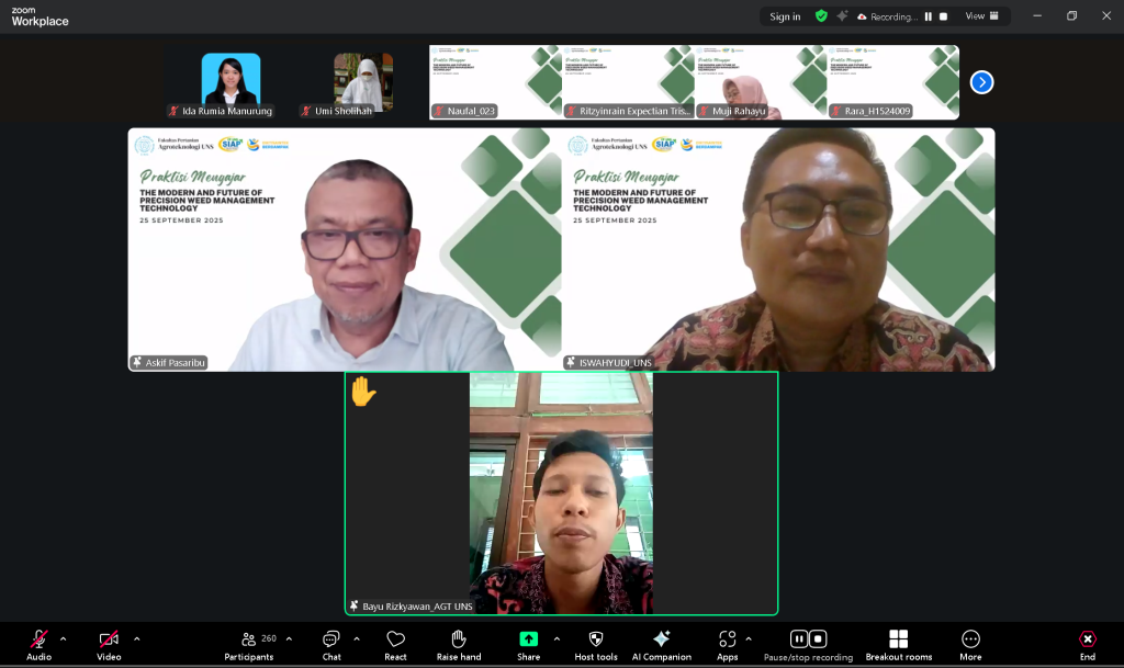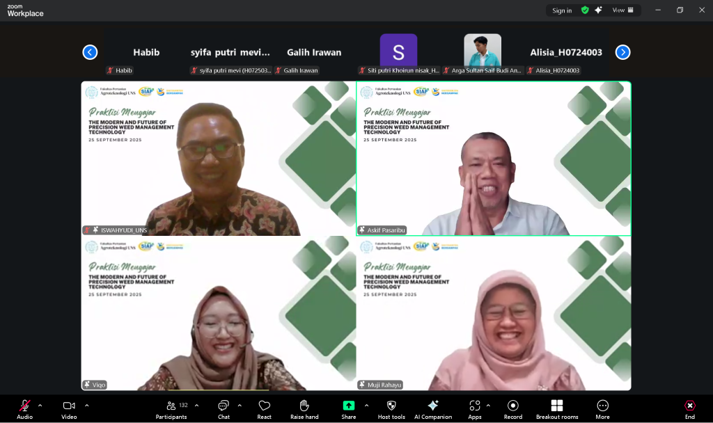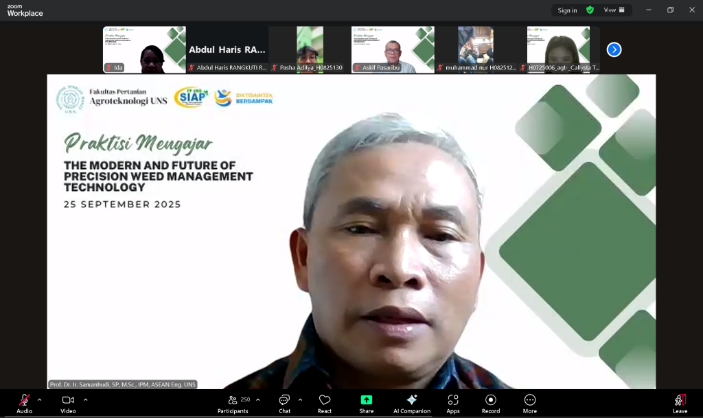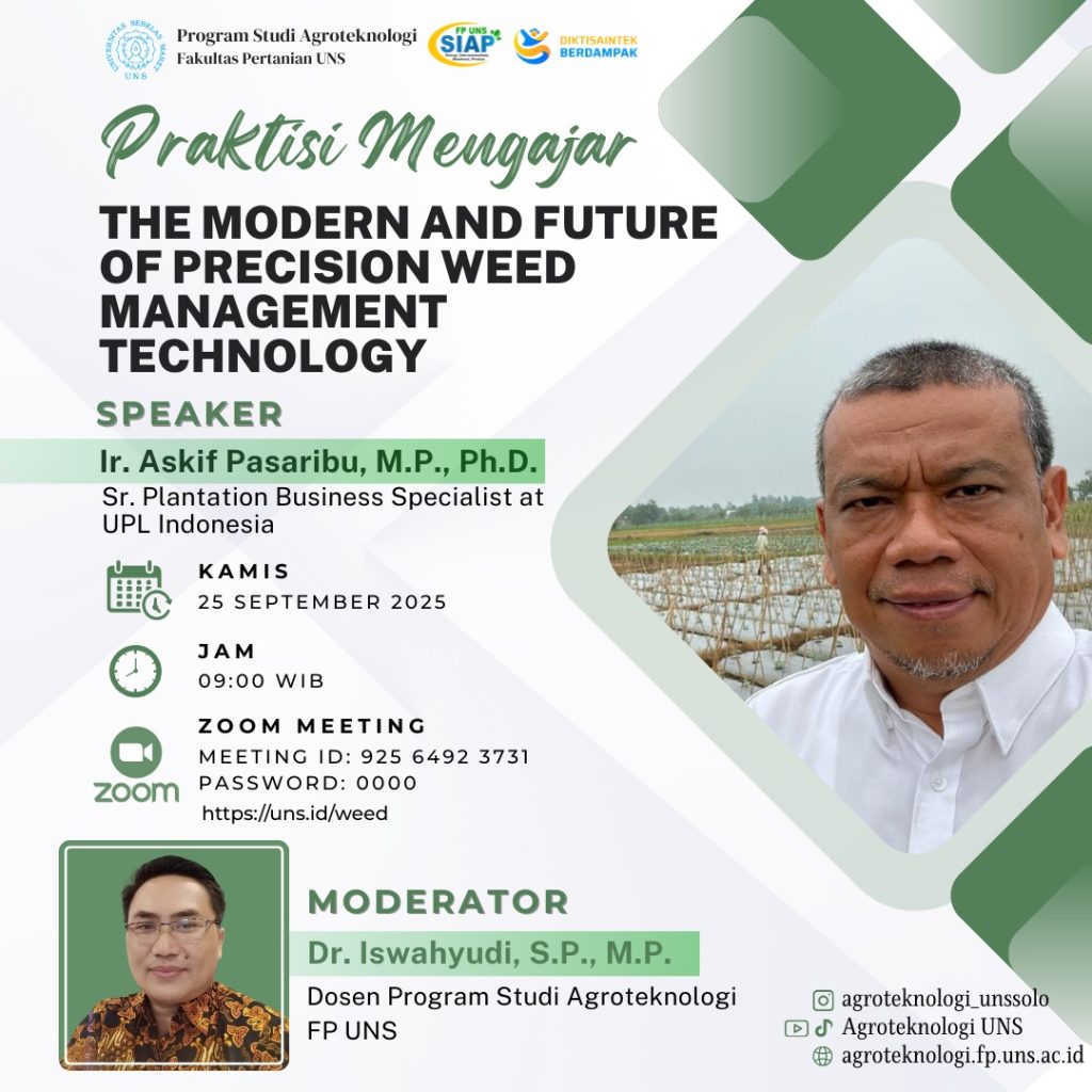Fakultas Pertanian Universitas Sebelas Maret (UNS) melalui Program Studi Agroteknologi menyelenggarakan kegiatan Praktisi Mengajar dengan tema The Modern and Future of Precision Weed Management Technology pada hari Kamis, 25 September 2025, pukul 09.00 WIB secara daring melalui Zoom Meeting.
