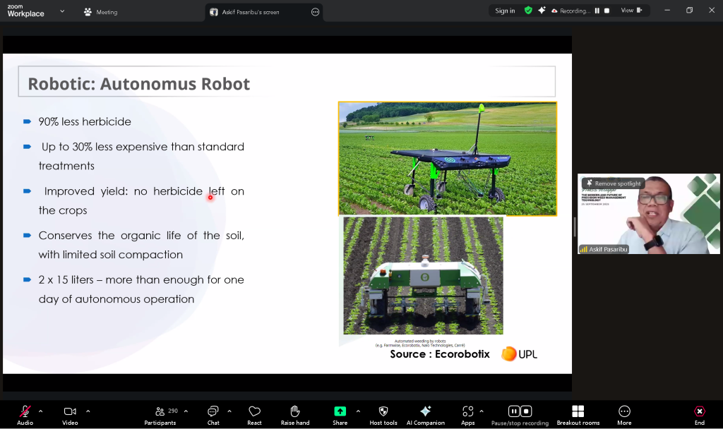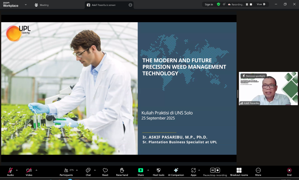 Kegiatan ini menghadirkan narasumber Ir. Askif Pasaribu, M.P., Ph.D., Senior Plantation Business Specialist di UPL Indonesia, yang membagikan wawasan dan pengalaman mengenai teknologi pengelolaan gulma presisi modern serta potensi perkembangannya di masa depan. Acara dipandu oleh moderator Dr. Iswahyudi, S.P., M.P., dosen Program Studi Agroteknologi Fakultas Pertanian UNS.