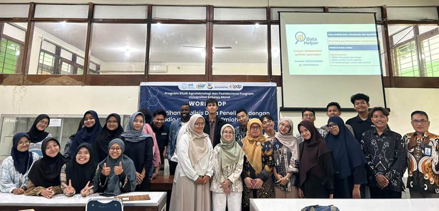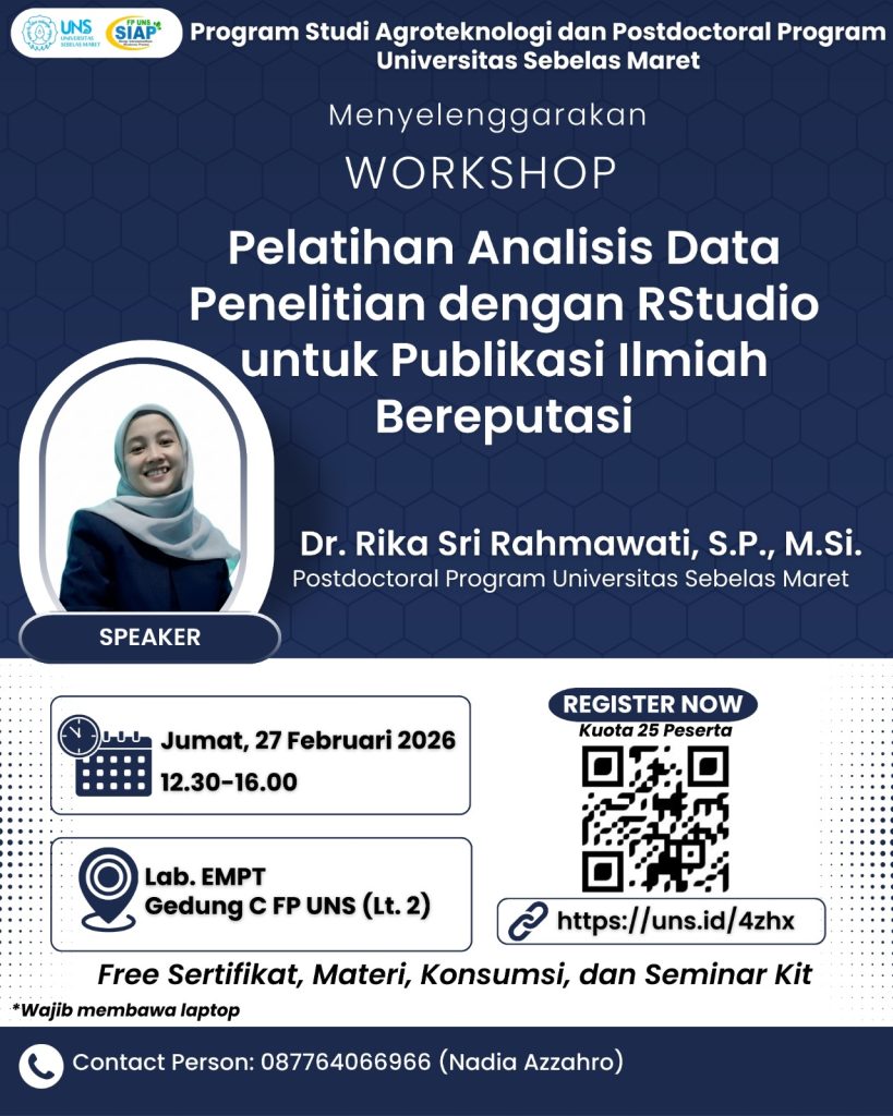 Program Studi Agroteknologi, Fakultas Pertanian, Universitas Sebelas Maret (UNS) Surakarta, menunjukkan komitmennya dalam mendorong produktivitas riset dosen dan mahasiswa dengan menyelenggarakan workshop bertajuk “Pelatihan Analisis Data dengan RStudio untuk Publikasi Ilmiah Bereputasi” . Kegiatan yang berlangsung pada hari Jumat, 27 Februari 2026 di Laboratorium Ekologi dan Manajemen Produksi Tanaman ini diikuti oleh 25 partisipan yang terdiri dari mahasiswa S1, S2, S3, serta para dosen program studi Agroteknologi FP UNS.